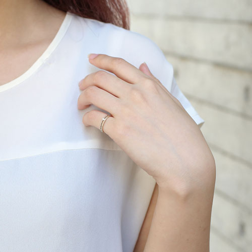 2連デザインの中心に0.01ctのダイヤモンド2石を使用した上品なリング。華奢なフォルムが指を細く長くみせてくれます。