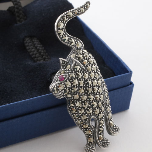 「エレガント&ゴージャス」シルバー925 ネコデザインブローチ兼ペンダントバンコクにあるプランダジュエリーはタイで3本の指に入るジュエリー生産量を誇り世界中に輸出しています。最高の教育を受けたデザイナーたちが自由に自らの感性を表現できるので他社にない魅力的なジュエリーが誕生しています。きびしい基準のカラーストーンの選別と品質管理が世界一きびしい日本でいつまでも愛されるジュエリーを作るのです。地金部分にはシルバー925を使用し、マーカサイトで輝きのあるブローチ兼ペンダント。首周りや胸元を上品で華やかに引き立てくれます。チェーンの長さはカットボールチェーン50cmで服の上からでも上品に着けて頂けます。また、チェーンを外してブローチとしてもお使いいただけるようにシャダン式の留具を内側に取り付けています。プレゼントにもおススメです!