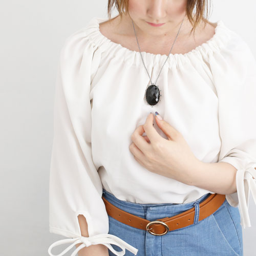 首元から抜群の存在感を放つペンダントは、55cmのロングレングスのチェーンと