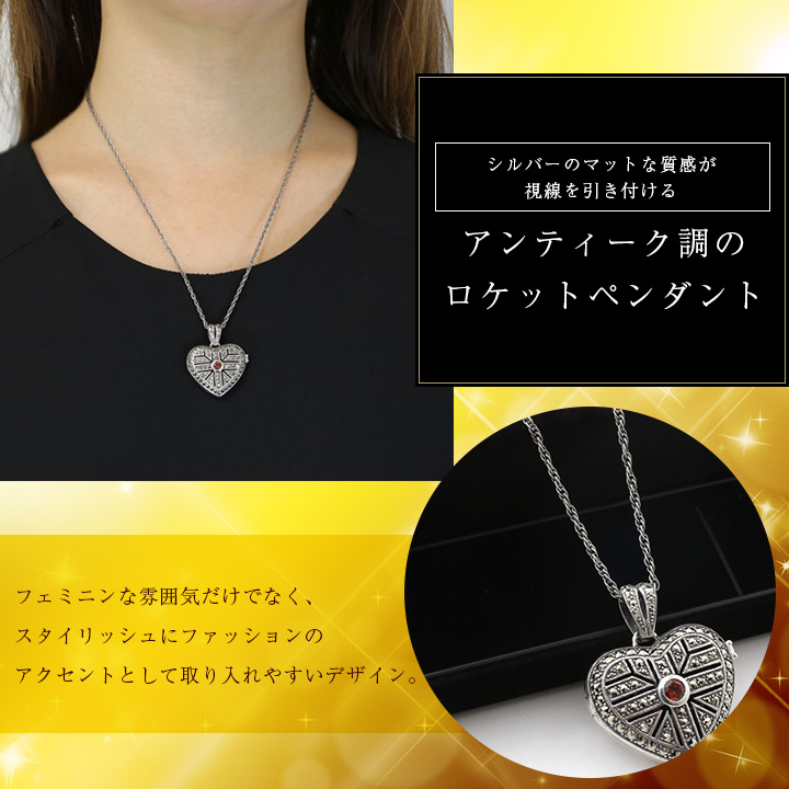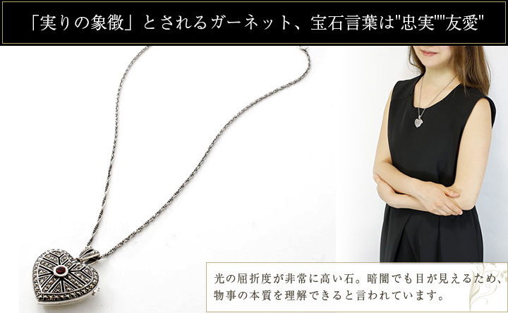 シルバー、ガーネット、マルカジットと贅沢に3つの素材を使用したタイ製ロケットペンダント。シルバーは聖なる金属として古くから広く愛され、人間の歴史を彩ってきました。ゴールドの輝きとは違い、落ち着いてシックな雰囲気があるので、可愛らしいハートのモチーフも甘すぎずお着け頂けます。埋め込まれたガーネットは、日本では柘榴石(ざくろ石)と呼ばれ、古来から世界中で神聖な石として慕われてきました。1月の誕生石としても有名で、パーソナルなギフトにもおすすめ♪細かくマルカジットを施すことで、光を多く取り込み、より輝きを増すデザインに◎約50cmのセミロングレングスでコーディネートのアクセントにもなり、縦ラインが強調されシャープな印象をプラス。大切な写真や小物を入れて共にお過ごしください。