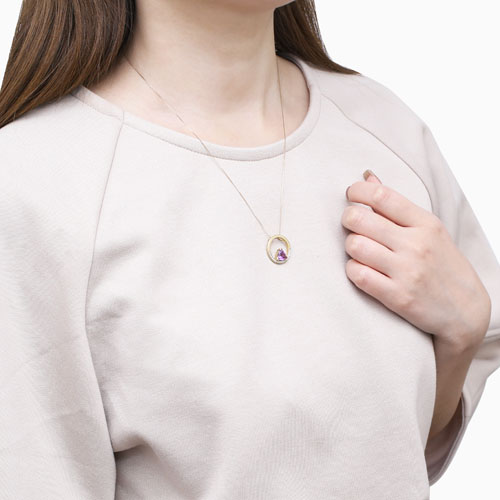 ストーンにはアメジストを使用。首元からさりげなく艶やかに輝くその姿は、ゴールドカラーとの相性が抜群♪