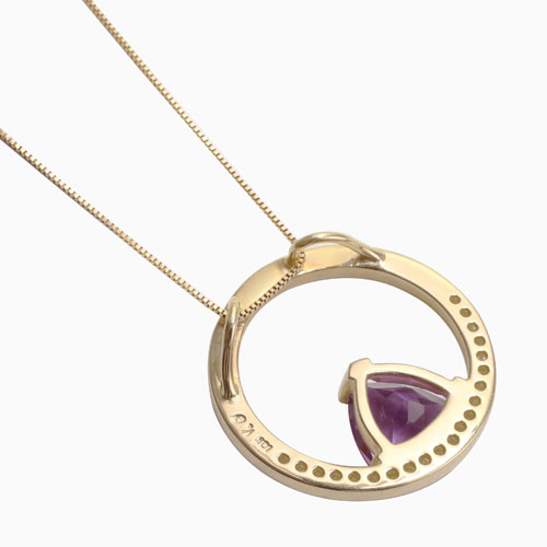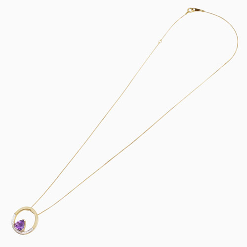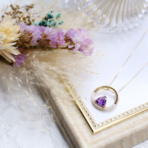 タイ・バンコクにあるプランダジュエリーは3本の指に入るジュエリー生産量を誇り、世界中に輸出しています。最上な教育を受けた優秀なデザイナーたちが自らの感性を自由に表現し、他社にない魅力的なジュエリーを生み出しています。厳格なカラーストーンの選別と品質管理が世界一厳しい日本でいつまでも愛されるジュエリー。ストーンにはアメジストを使用。首元からさりげなく艶やかに輝くその姿は、ゴールドカラーとの相性が抜群♪地金部分には10金(K10)を使用し、いっそう美しく輝かせてくれます。
