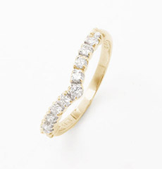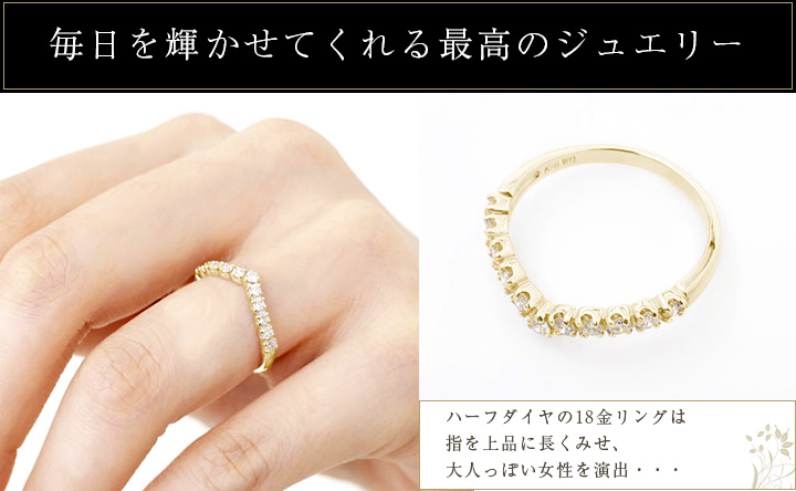 ハーフダイヤのデザインリングは光を反射しきらきらと美しく輝かせてくれます。