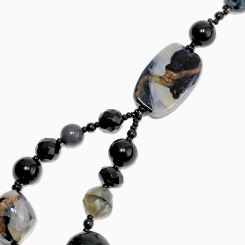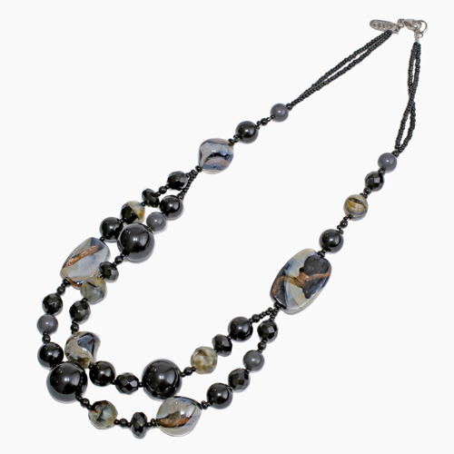 イタリアの最先端ファッションの都「ミラノ」。そこで活躍するジュエリーデザイナーのアヴェ・テッタマンティ。ベニスの熟練職人によるベネチアンガラスを使い、洗練されたデザインセンスとイタリア人ならではの色使いを持ち合わせ、イタリアはもちろん世界中の大人の女性たちを魅了しています。彼女の作品は決して派手すぎずそれでいて絶対的な存在感があり、どんな服装にもコーディネートしやすいように考えられています。世界的に人気の2連タイプチェーンをブラック系でまとめ上げたセンスの良い上品でクールな逸品です。ベネチアンガラス、合金、樹脂を絶妙なバランスで使い、ボリューム感と軽い着け心地を実現。 特別な日のプレゼントにもぴったりです。※数量限定の商品ですので、売り切れの際はご了承ください。 手作りのため、パーツの配列、配色、留具の仕様が写真と若干異なる場合がございます。ご了承下さい。