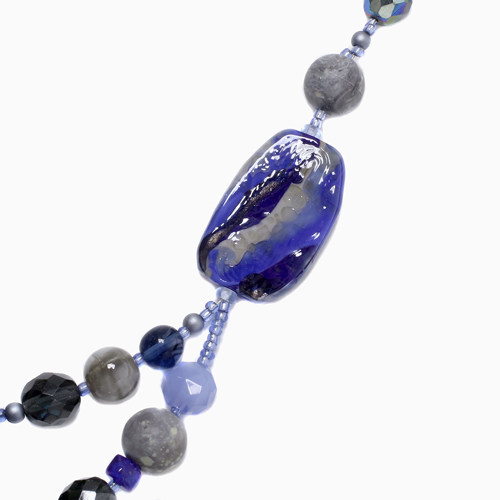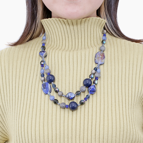 イタリアの最先端ファッションの都「ミラノ」。そこで活躍するジュエリーデザイナーのアヴェ・テッタマンティ。ベニスの熟練職人によるベネチアンガラスを使い、洗練されたデザインセンスとイタリア人ならではの色使いを持ち合わせ、イタリアはもちろん世界中の大人の女性たちを魅了しています。彼女の作品は決して派手すぎずそれでいて絶対的な存在感があり、どんな服装にもコーディネートしやすいように考えられています。世界的に人気の2連タイプチェーンをブルー系でまとめ上げたセンスの良い上品でクールな逸品です。ベネチアンガラス、合金、樹脂を絶妙なバランスで使い、ボリューム感と軽い着け心地を実現。 特別な日のプレゼントにもぴったりです。※数量限定の商品ですので、売り切れの際はご了承ください。 手作りのため、パーツの配列、配色、留具の仕様が写真と若干異なる場合がございます。ご了承下さい。
