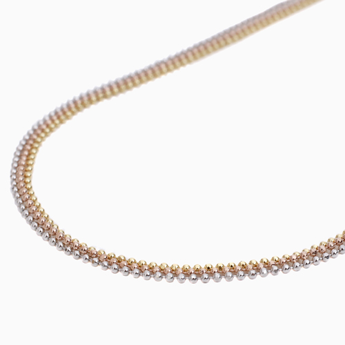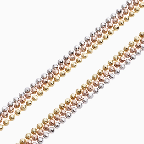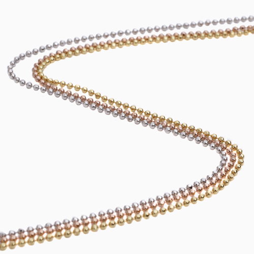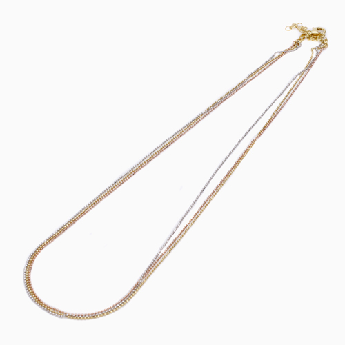 シルバーのカットボールチェーンにピンク、イエロー、ホワイトの仕上げを施して3連に加工したネックレス。