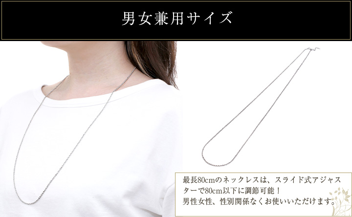 長さ留具を外さずに頭からかぶれる約80cmのロングサイズです。しかもシリコンスライドで80cmまでのお好みの長さに調整可能です。