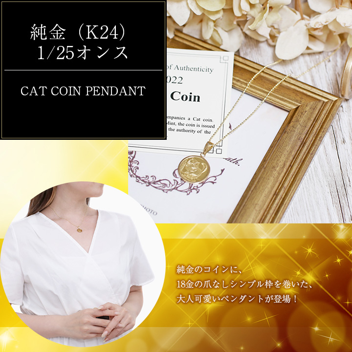 純金(K24)を1.2gも使ったコイン(1/25オンス)に、18金のシンプル枠を巻いた、上品でエレガントなコインペンダント。表面は可愛くてキュートなネコをモチーフ、裏面はエリザベス女王の美しい横顔デザインで、リバーシブルにその日の気分や服装に合わせられます!チェーンにはイタリア製シルバー925のサービスチェーンをセット!キラキラ輝くカットボールは肌なじみもよく、デコルテ周りを上品に輝かせてくれます。