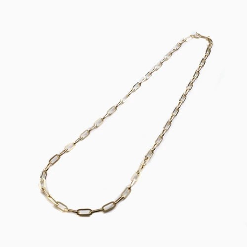 日本製にはない細長いフラットなアズキタイプチェーンを組合わせたデザインはたくさんの輝く面を作り胸元を豪華に演出。