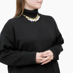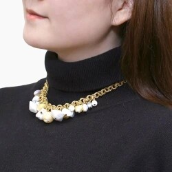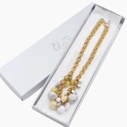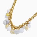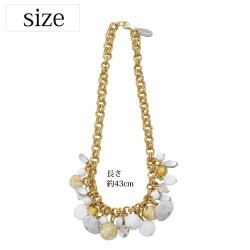 ゴールドカラーにホワイト系をセットし、中央にボリュームをもたせた、エレガントで上品なネックレスは、 ベネチアンガラス、合金、樹脂を絶妙なバランスで使い、ボリューム感と軽い着け心地を実現。 特別な日のプレゼントにもぴったりです。