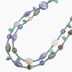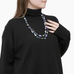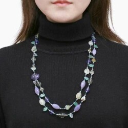 グリーンとパープルの自然の暖かみを感じる色合いで落ち着きのある上品なネックレスは、 ベネチアンガラス、合金、樹脂を絶妙なバランスで使い、ボリューム感と軽い着け心地を実現。特別な日のプレゼントにもぴったりです。