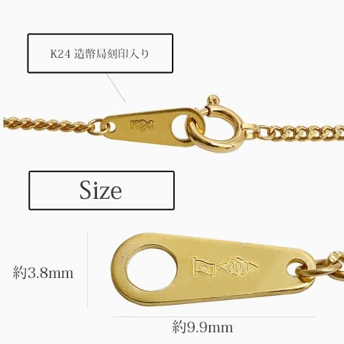 - 純金製品は18金に比べ純度が高く素材の価値がありますが、反面柔らかく、取扱いには十分ご注意ください。無理に引っ張ったり、重いものを載せたりせず、なるべくペンダント用のチェーンとしてはお使いにならないようにしてください。