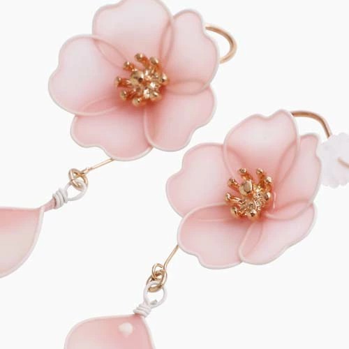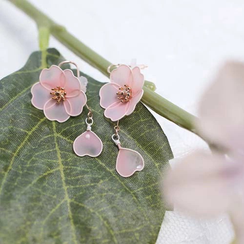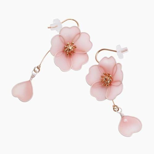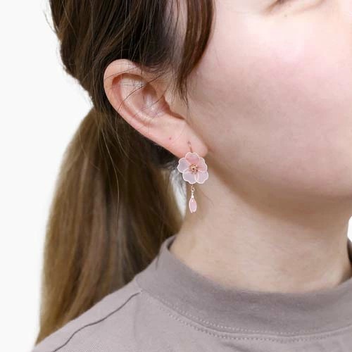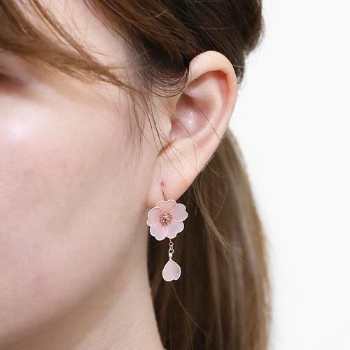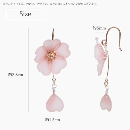 アートを身にまとう、お洒落な和風ピアスが登場☆ 日本に昔からあるモチーフを アクセサリーにした魅力あふれる逸品 春や夏にもにぴったりの シアーカラーの桜モチーフは 花も花びらもゆれる仕様で 柔らかな雰囲気を醸し出してくれます。 浴衣や着物等和服にはもちろん、 普段の装いに合わせてもかわいいピアスは プレゼントにもおススメのピアスです♪ ハンドメイドの為、まったく同じ柄は存在しない、 自分だけのピアスをお楽しみください。