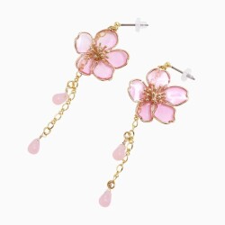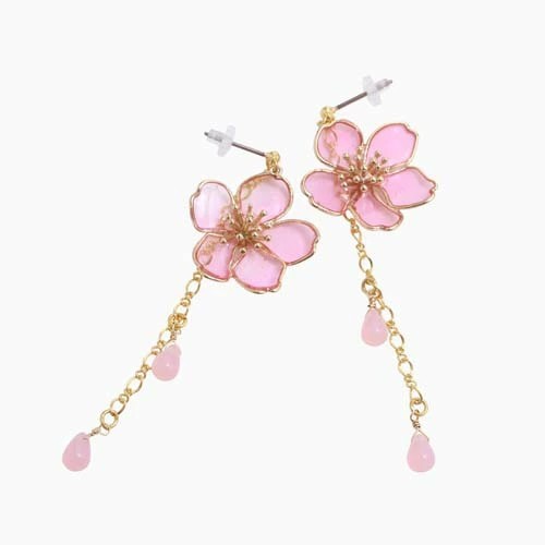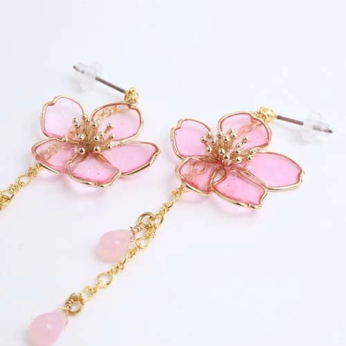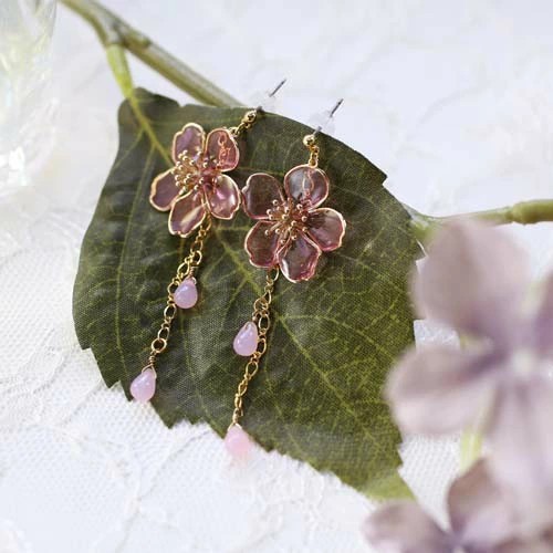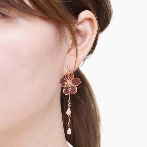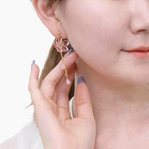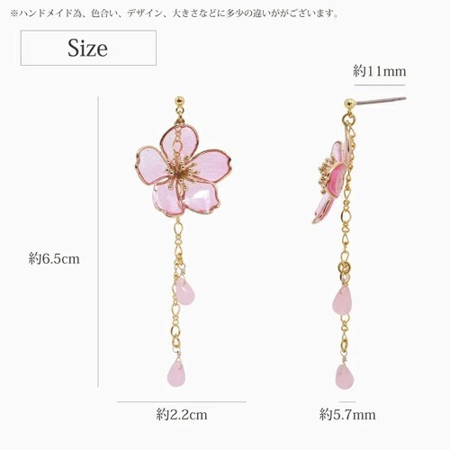 アートを身にまとう、お洒落な和風ピアスが登場☆ 日本に昔からあるモチーフを アクセサリーにした魅力あふれる逸品 耳にちょうどいいサイズの桜のモチーフに ゆらゆらゆれるチェーンが付いたピアスです。 チェーンに付く雫は 風に舞う花びらを連想させます。 浴衣や着物等和服にはもちろん、 普段の装いに合わせてもかわいいピアスは プレゼントにもおススメのピアスです♪ ハンドメイドの為、まったく同じ柄は存在しない、 自分だけのピアスをお楽しみください。