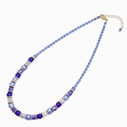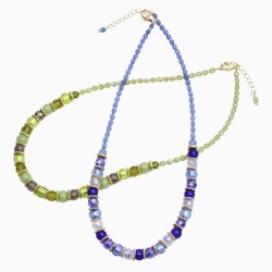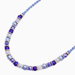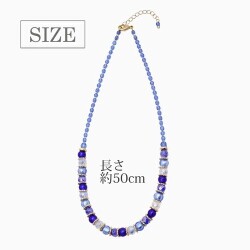 イタリア・ムラーノ島で、マエストロと呼ばれる熟練した職人たちが、べネチアンガラスの伝統の技法を用い一つ一つ丁寧に手作りしています。 その美しい模様は、芸術品とまで称されるほど。 手作りのため、まったく同じものは2つとなく、世界にたった一つのあなただけのネックレスといえます。 ベネチアンビーズガラスを使って、ミラノで人気の若手アクセサリーデザイナー・キアラ(CHIARA)がおしゃれでわくわくする感性のネックレスを作りました。 オーシャンブルーにゴールドを配したかわいい色使い、でも決して派手ではなく日本の女性に気軽に着けてもらえるように考えたそうです。 ※職人による完全な手作りベネチアンガラスを使っていますので色合いや配色がそれぞれ多少異なります。