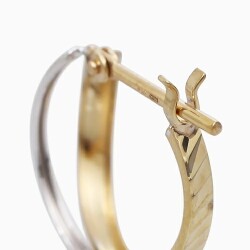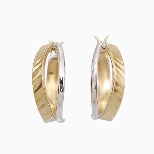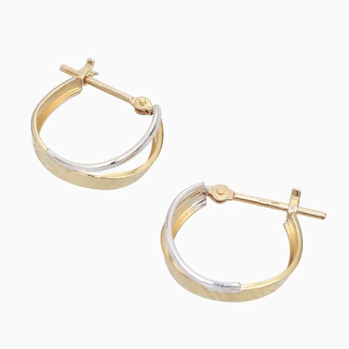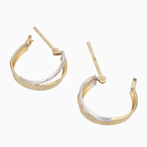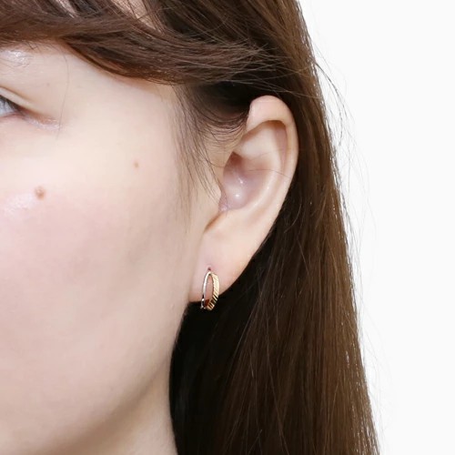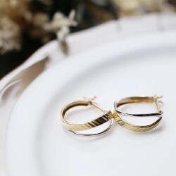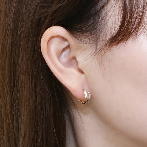 ポストをパチッとはめるだけの 10金ツーカラーのカット入ダブルフープデザインが大人可愛いピアス! 肌馴染みの良いゴールド&ホワイトで素肌まで綺麗に魅せてくれ、着けるだけで華やかさがUPします。 キャッチレスタイプのツーカラーデザインが美しいフープピアスは、 どんなスタイルやシーンにも合わせやすく、普段づかいのジュエリーとしても、大活躍すること間違い無し! 地金オンリーの可愛いピアスは、流行や年齢に関係なく、きっと長く、大事にお使い頂けます。 他のピアスとの重ね着けにもちょうど良く、アクセサリーのおしゃれの幅も広がります。 女性に人気のデザインピアスはプレゼントにもおススメです。