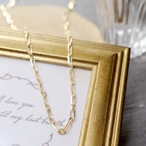高級素材である、18金(K18)を惜しみなく使用した、有名ブランドC社が火をつけた世界的に人気のデザイン。繊細でシンプルなのに気品あふれるネックレス。イタリアならではの洗練されたデザインのペーパークリップネックレスは、日本製にはない細長いフラットS&Lのアズキタイプチェーンを組み合わせ、たくさんの輝く面を作り胸元を豪華に演出。