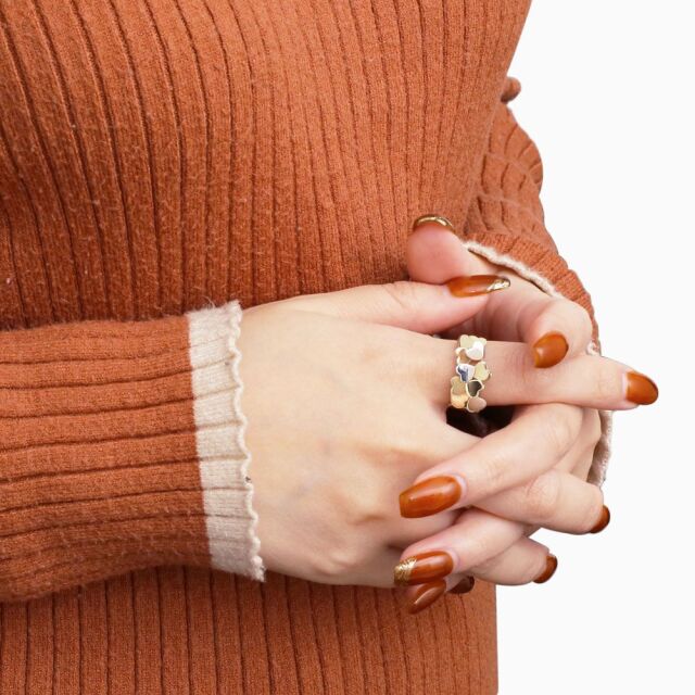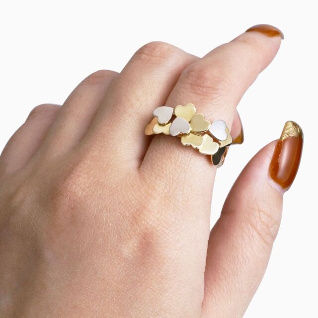 上品で主張し過ぎない存在感!10金スリーカラーのゴールドを使用した、たくさんのハートの面が輝くゴールドリングが登場。