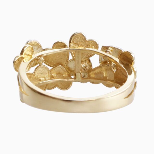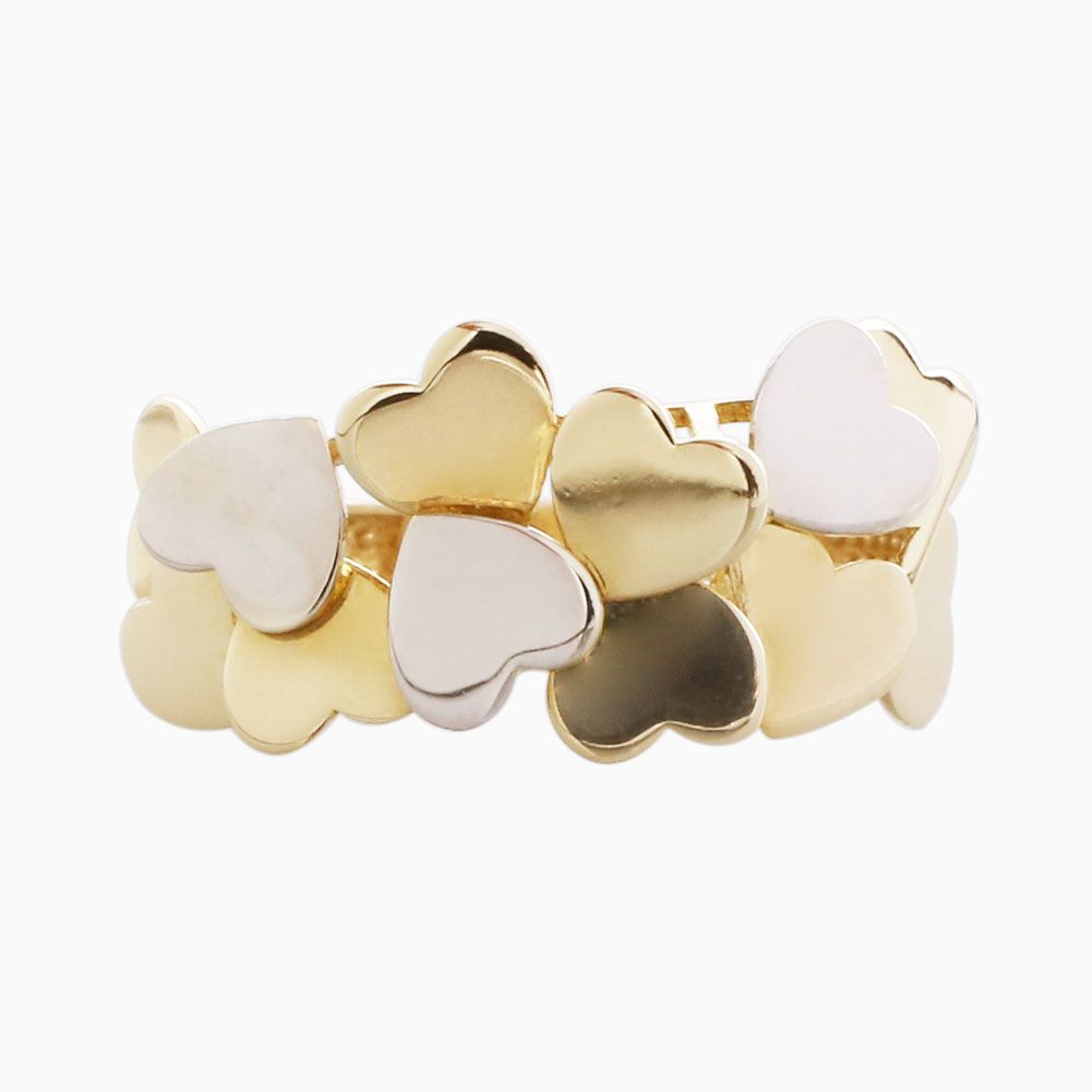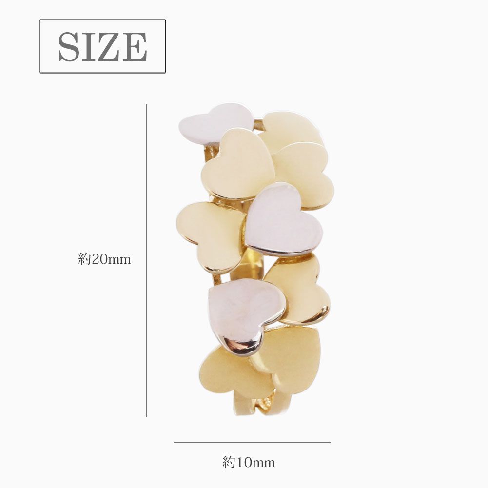 上品で主張し過ぎない存在感!10金ツーカラーのゴールドを使用した、たくさんのハートの面が輝くゴールドリングが登場。 肌馴染みの良いゴールドカラーが素肌まで綺麗に魅せてくれ、着けるだけで華やかさがUPします。 また、どんなスタイルにも合わせやすいのでパーティースタイルや普段づかいのジュエリーとしても大活躍すること間違い無し! 飽きることのない上品なデザインは、流行や年齢に関係なく、きっと長く大事にお使い頂けます。 また、ラッピングも無料で対応しておりますので、プレゼントにもピッタリ!
