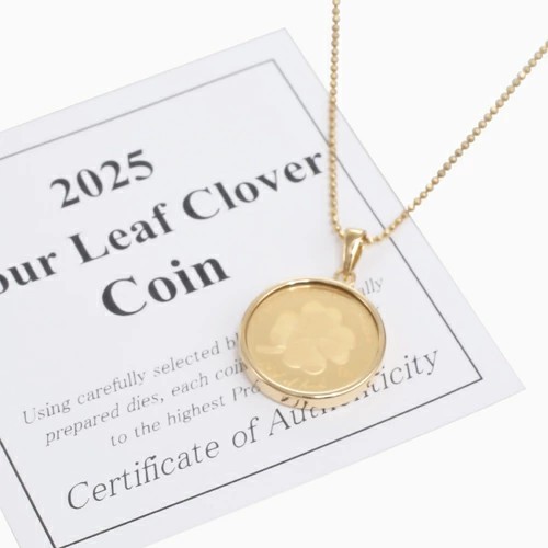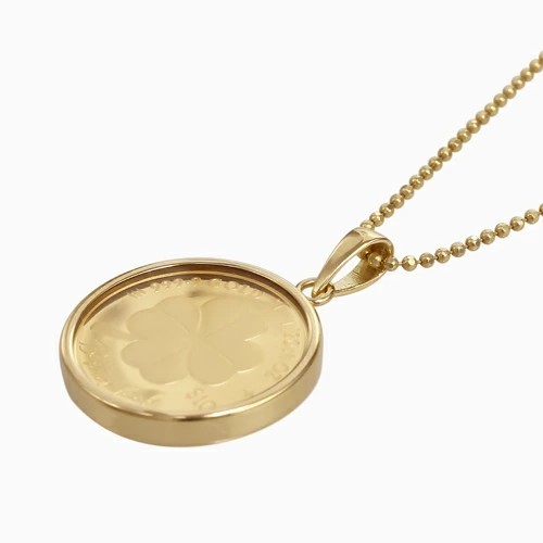 世界的に金地金が高騰している昨今、資産価値もありお守りとしてやプレゼントにも喜ばれます。片面には可愛いマット仕上げの四葉のクローバー、片面にはマットなチャールズ国王の小さくて可愛い黄金コインペンダントは、 どんな服装にも合わせやすく、カジュアルはもちろん、オフィススタイルやフォーマルなスタイルに合わせて頂いても素敵です!