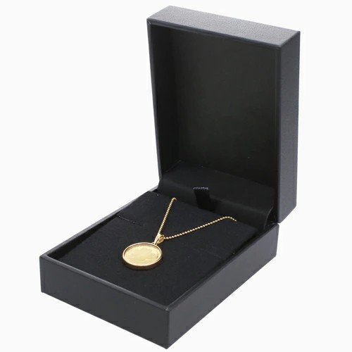 ロイヤルミントの純金コインに、両面ガラス付の爪のない18金フセコミ枠を巻き、イタリア製のシルバーカットボールチェーンをセットしたお洒落なペンダント。