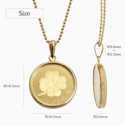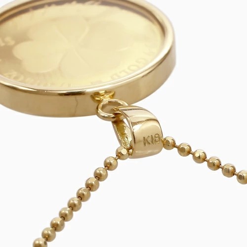 | 素材 | ・コイン(24金 1/20オンス約1.5g) ・枠(18金) ・チェーン(シルバー925ゴールド仕上げ) イタリア製カットボールチェーン ・長さ約45cm(アジャスター約5cm含む) ・留具は引輪式 ・保護ガラス |