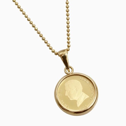 | 素材 | ・コイン(24金 1/30オンス約1g) ・枠(18金) ・チェーン(シルバー925ゴールド仕上げ) イタリア製カットボールチェーン ・長さ約45cm(アジャスター約5cm含む) ・留具は引輪式 ・保護ガラス |