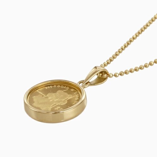 ロイヤルミントの純金コインに、両面ガラス付の爪のない18金フセコミ枠を巻き、イタリア製のシルバーカットボールチェーンをセットしたお洒落なペンダント。