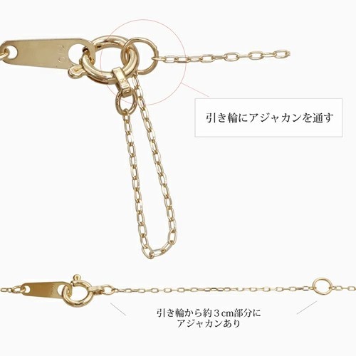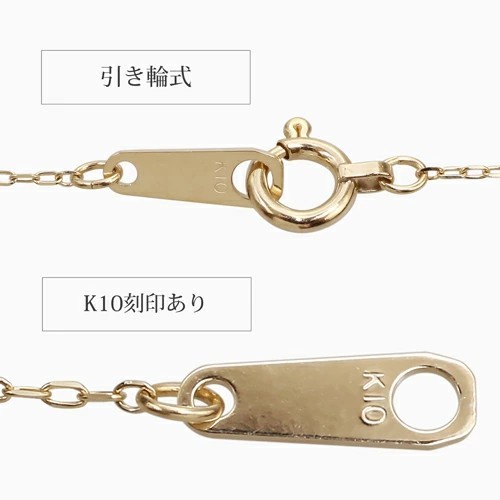 | 素材 | 10金(K10) チェーン ・アズキチェーン ・約40cm(約3cm部分にアジャスターあり) ・留具は引輪式 |