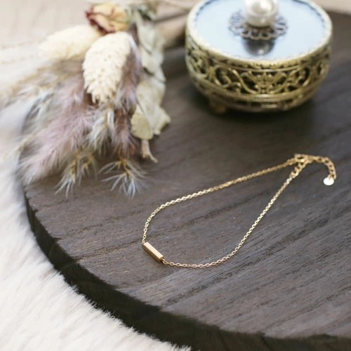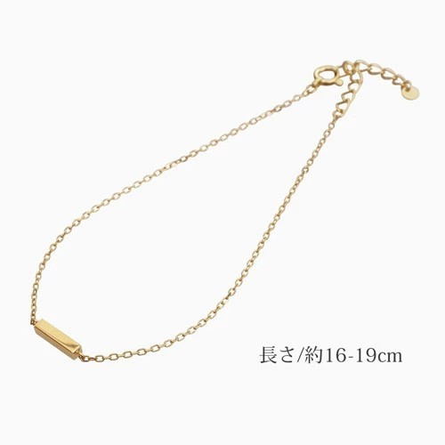 シンプルをコンセプトに、モダンなスティックパーツをセンターにセットした、18金イエローゴールドのお洒落なブレスレット! チェーンは長さ約16cmから19cmまでお好みの長さに調整可能なアジャスター式になっており、端の部分には可愛いチャームも付いています。 18金のゴールドだけを使ったスマートデザインに細く繊細なアズキチェーンが可愛らしさを演出したブレスレットは、どんな服装にも合わせやすく、カジュアルはもちろんオフィススタイルやフォーマルなスタイルに合わせて頂いても素敵です!