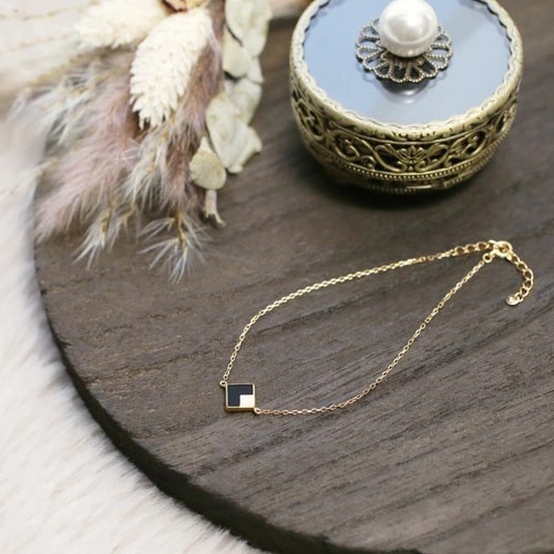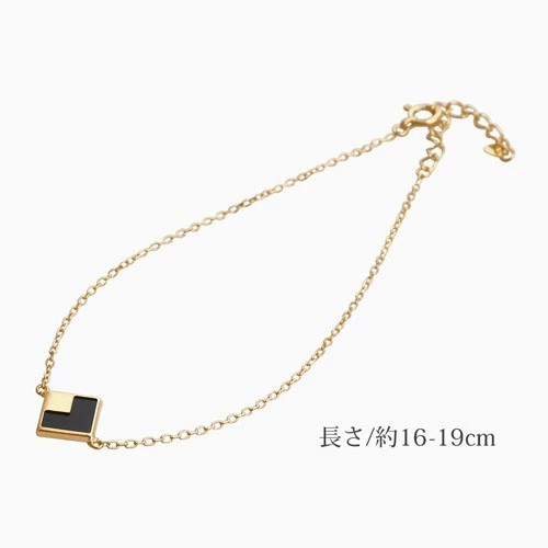 シンプルをコンセプトに、オニキスのスクエアパーツをセンターにセットした、18金イエローゴールドのお洒落なブレスレット! チェーンは長さ約16cmから19cmまでお好みの長さに調整可能なアジャスター式になっており、端の部分には可愛いチャームも付いています。 18金のゴールドを使ったスマートデザインに細く繊細なアズキチェーンが可愛らしさを演出したブレスレットは、どんな服装にも合わせやすくカジュアルはもちろんオフィススタイルやフォーマルなスタイルに合わせて頂いても素敵です!
