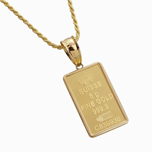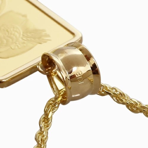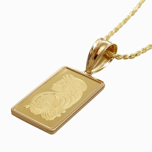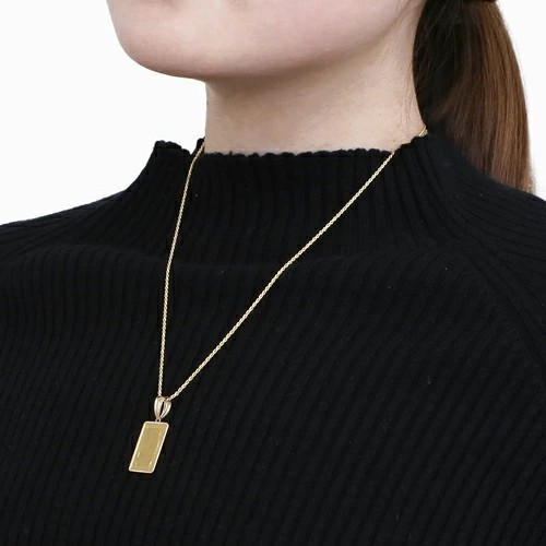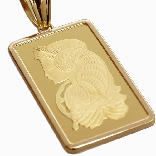 スイス・パンプ社鋳造、純金【フォルトゥーナインゴット】に、18金のシンプルフセコミ枠を巻いたインゴットペンダントが登場!