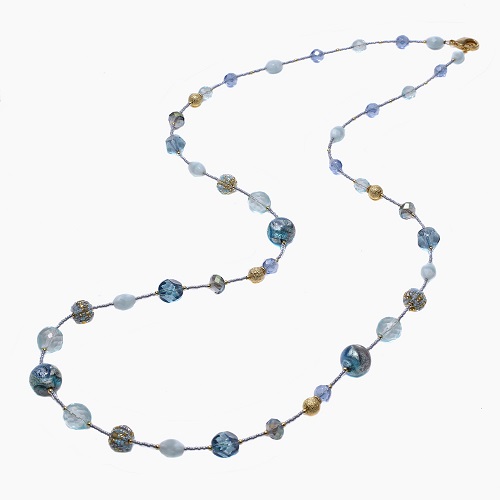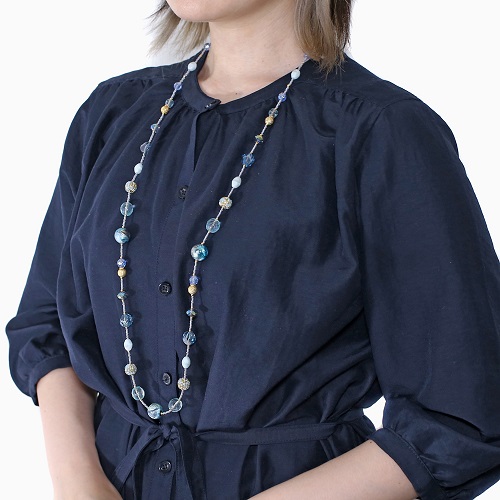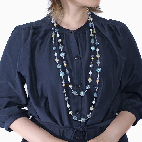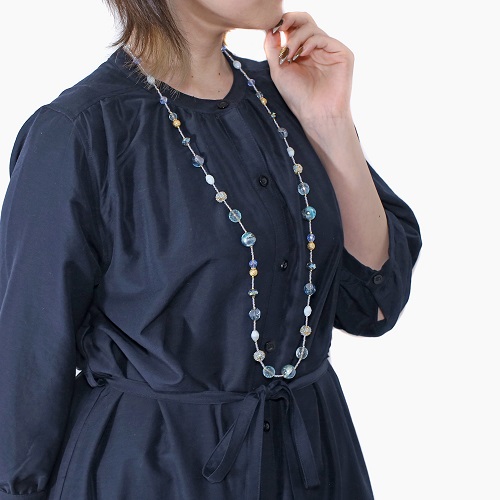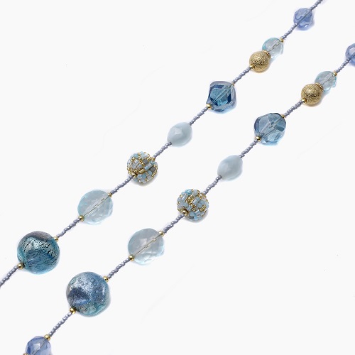 ブルー系ガラスとミッレカットを施したムラーノグラスを組み上げた、その色合いのコントラストが美しいデザインセンスはイタリア人デザイナーならではです。着けているとその色合いか感じる派手さは少なく、むしろ上品に自己主張をする大人のジュエリーと言えます。80cmの長さはマキシワンピースやコクーンなどに合わせやすく、カラフルな色遣いが特徴です。留め具を外さず頭からかぶれるのも便利です。少し短めの100cmもご用意しています。手作りのため、まったく同じものは2つとなく、世界にたった一つのあなただけのネックレスといえます。