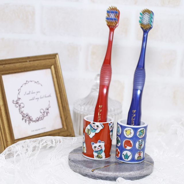九谷焼は、石川県南部で生産される色絵の磁器です。 久谷五彩(赤、黄、緑、紺、紫)という色鮮やかな上絵が特徴です。 上絵つきとは、本焼きした陶磁器の釉薬の上に顔料で模様を描き、再度焼く技法です。 その歴史は、江戸時代に加賀藩が良質な磁石を発見したのを機に、殖産政策として始められたとされたいます。上品な色合いの色鮮やかなで素敵な歯ブラシスタンドです。オシャレなデザインでおうちのインテリアにもおすすめです一般的な歯ブラシは2本、少し太めの歯ブラシも、小型電動歯ブラシにもお使いいただけます。底が抜けているので、掃除も簡単で中まで清潔に保てます。歯ブラシスタンド以外にも、受付や玄関先に置いてペン立てや印鑑入れ等にもお使いいただけます☆オシャレな歯ブラシスタンドセットは大切な人へのプレゼントにもお勧めです。無料でハイセンスなラッピングもございます!
