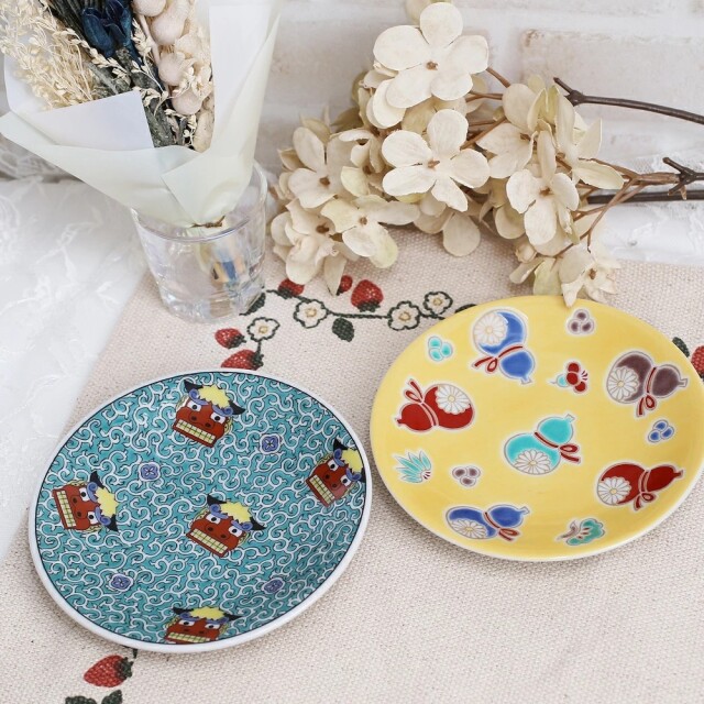 久谷五彩(赤、黄、緑、紺、紫)という色鮮やかな上絵が特徴です。