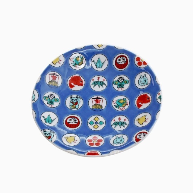 九谷焼は、石川県南部で生産される色絵の磁器です。久谷五彩(赤、黄、緑、紺、紫)という色鮮やかな上絵が特徴です。上絵つきとは、本焼きした陶磁器の釉薬の上に顔料で模様を描き、再度焼く技法です。その歴史は、江戸時代に加賀藩が良質な磁石を発見したのを機に、殖産政策として始められたとされたいます。思わず微笑むデザインと色合い、ちょっとした料理にもお使いいただける上品な小皿です。お祝いの贈り物や海外の方へのお土産としても喜ばれるアイテムです!普段使いにもおもてなしにも喜ばれるてのひらに収まる愛らしいサイズです。薬味やお漬物、一口サイズにカットしたフルーツなどちょっとしたものがおしゃれに盛り付けられます!実用性はもちろん、結婚祝い、記念日、開店祝いなどの贈り物としてや、コレクション、インテリアとしても大人気の小皿です。
