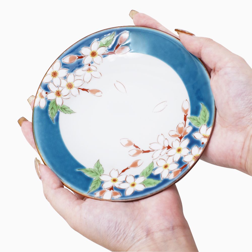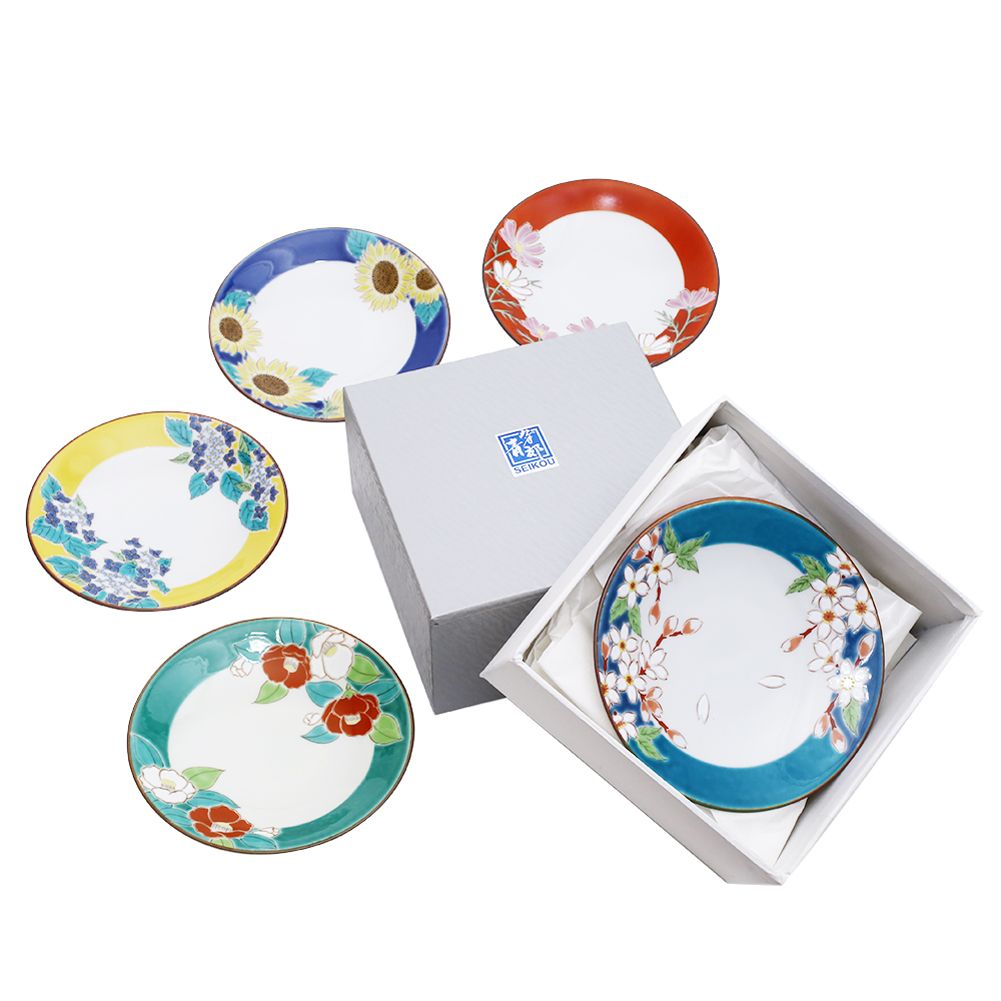 九谷焼は、石川県南部で生産される色絵の磁器です。久谷五彩(赤、黄、緑、紺、紫)という色鮮やかな上絵が特徴です。上絵つきとは、本焼きした陶磁器の釉薬の上に顔料で模様を描き、再度焼く技法です。その歴史は、江戸時代に加賀藩が良質な磁石を発見したのを機に、殖産政策として始められたとされたいます。九谷焼の色鮮やかで、個性的な色合いの四季の花5点セットは、食卓も食器棚も華やかになる楽しさも味わえます。食卓も食器棚も華やかになる楽しさも味わえます。お祝いの贈り物や海外の方へのお土産としても喜ばれるアイテムです!ちょっとしたものがおしゃれに盛り付けられます!実用性はもちろん、結婚祝い、記念日、開店祝いなどの贈り物としてや、コレクション、インテリアとしても大人気の小皿です。