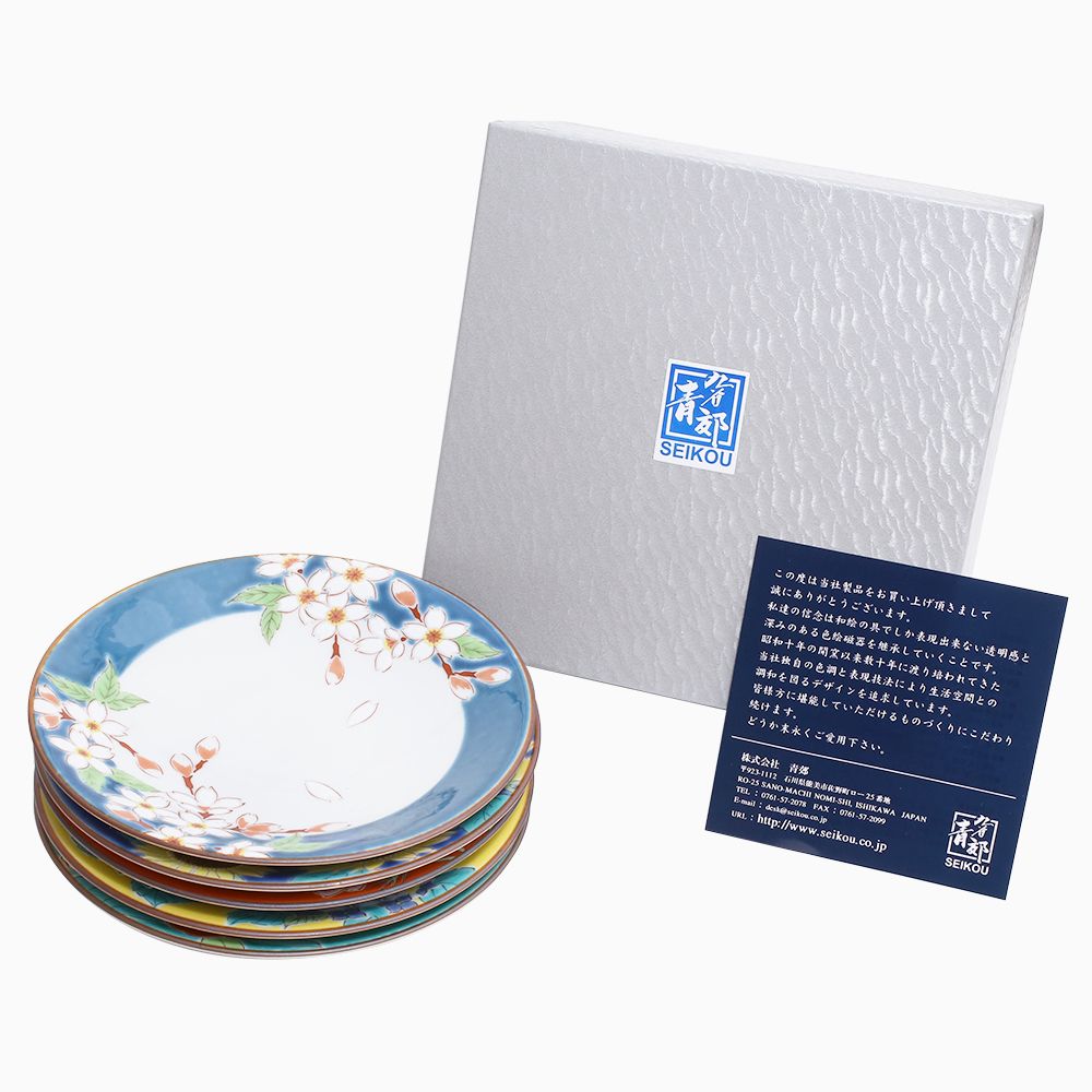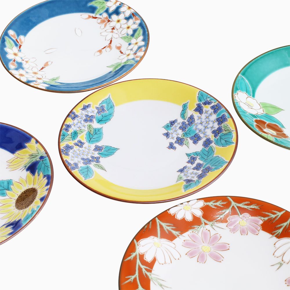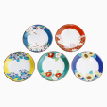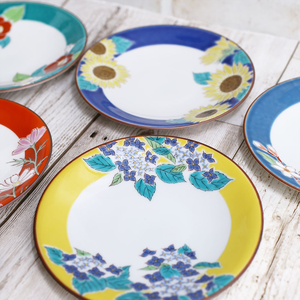 九谷焼の色鮮やかで、個性的な色合いの四季の花5点セットは、食卓も食器棚も華やかになる楽しさも味わえます。