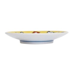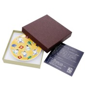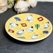 九谷焼は、石川県南部で生産される色絵の磁器です。久谷五彩(赤、黄、緑、紺、紫)という色鮮やかな上絵が特徴です。上絵つきとは、本焼きした陶磁器の釉薬の上に顔料で模様を描き、再度焼く技法です。その歴史は、江戸時代に加賀藩が良質な磁石を発見したのを機に、殖産政策として始められたとされたいます。思わず微笑むデザインと色合い、ちょっとした料理にもお使いいただける上品な小皿です。お祝いの贈り物や海外の方へのお土産としても喜ばれるアイテムです!普段使いにもおもてなしにも喜ばれるてのひらに収まる愛らしいサイズです。薬味やお漬物、一口サイズにカットしたフルーツなどちょっとしたものがおしゃれに盛り付けられます!実用性はもちろん、結婚祝い、記念日、開店祝いなどの贈り物としてや、コレクション、インテリアとしても大人気の小皿です。