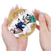 九谷焼は、石川県南部で生産される色絵の磁器です。久谷五彩(赤、黄、緑、紺、紫)という色鮮やかな上絵が特徴です。上絵つきとは、本焼きした陶磁器の釉薬の上に顔料で模様を描き、再度焼く技法です。その歴史は、江戸時代に加賀藩が良質な磁石を発見したのを機に、殖産政策として始められたとされたいます。思わず微笑むデザインと色合い、ちょっとした料理にもお使いいただける上品な小皿です。お祝いの贈り物や海外の方へのお土産としても喜ばれるアイテムです!普段使いにもおもてなしにも喜ばれるてのひらに収まる愛らしいサイズです。薬味やお漬物、一口サイズにカットしたフルーツなどちょっとしたものがおしゃれに盛り付けられます!実用性はもちろん、結婚祝い、記念日、開店祝いなどの贈り物としてや、コレクション、インテリアとしても大人気の小皿です。