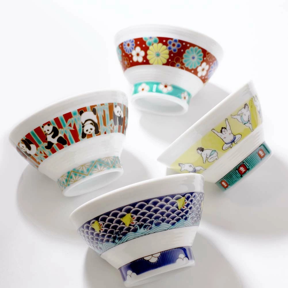 九谷焼は、石川県南部で生産される色絵の磁器です。久谷五彩(赤、黄、緑、紺、紫)という色鮮やかな上絵が特徴です。上絵つきとは、本焼きした陶磁器の釉薬の上に顔料で模様を描き、再度焼く技法です。その歴史は、江戸時代に加賀藩が良質な磁石を発見したのを機に、殖産政策として始められたとされたいます。上品な色合いの色鮮やかで素敵な色絵千段飯碗です。オシャレで可愛いパンダのデザインでおうちのインテリアにもおすすめです。