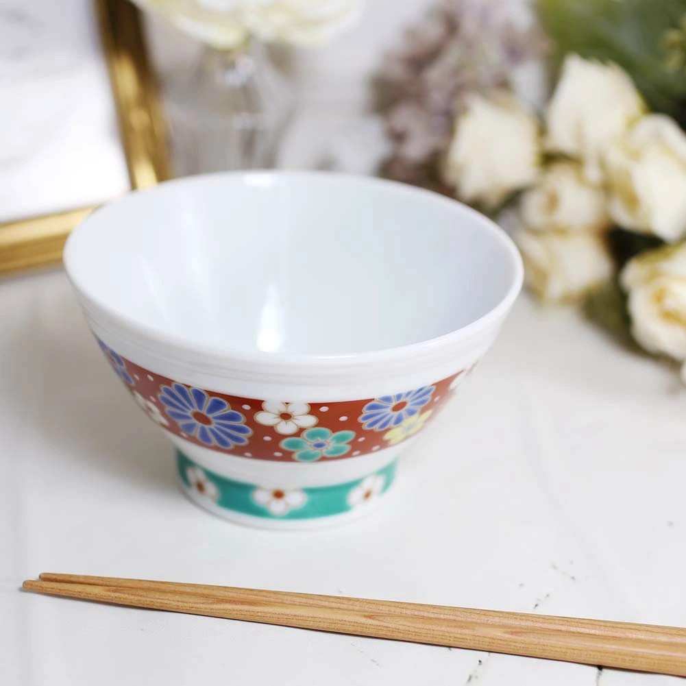 九谷焼は、石川県南部で生産される色絵の磁器です。久谷五彩(赤、黄、緑、紺、紫)という色鮮やかな上絵が特徴です。上絵つきとは、本焼きした陶磁器の釉薬の上に顔料で模様を描き、再度焼く技法です。その歴史は、江戸時代に加賀藩が良質な磁石を発見したのを機に、殖産政策として始められたとされたいます。上品な色合いの色鮮やかで素敵な色絵千段飯碗です。オシャレで可愛い梅菊のデザインでおうちのインテリアにもおすすめです。