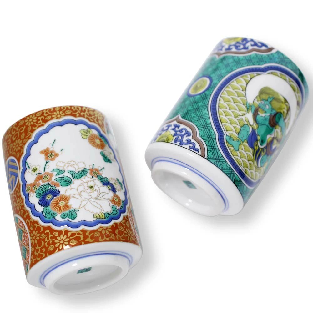 九谷焼は、石川県南部で生産される色絵の磁器です。久谷五彩(赤、黄、緑、紺、紫)という色鮮やかな上絵が特徴です。上絵つきとは、本焼きした陶磁器の釉薬の上に顔料で模様を描き、再度焼く技法です。その歴史は、江戸時代に加賀藩が良質な磁石を発見したのを機に、殖産政策として始められたとされたいます。九谷焼の色鮮やかで、個性的な色合いのオシャレな湯呑は、実用的でちょうどいいサイズ感。食器棚が華やかになる楽しさも味わえます。大切な人へのプレゼントにもお勧めです。無料でハイセンスなラッピングもございます!