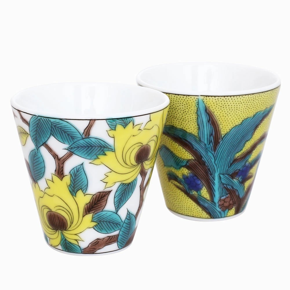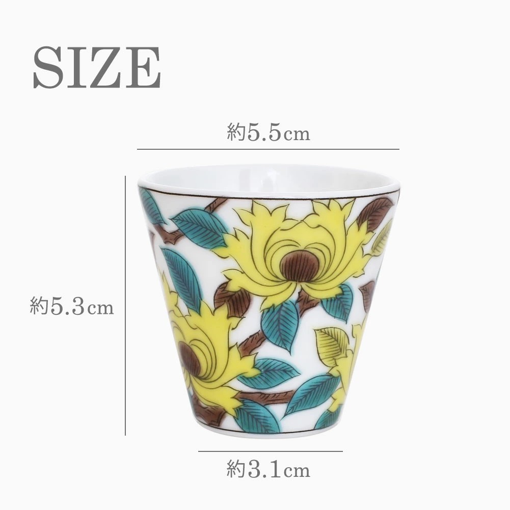 九谷焼は、石川県南部で生産される色絵の磁器です。久谷五彩(赤、黄、緑、紺、紫)という色鮮やかな上絵が特徴です。上絵つきとは、本焼きした陶磁器の釉薬の上に顔料で模様を描き、再度焼く技法です。その歴史は、江戸時代に加賀藩が良質な磁石を発見したのを機に、殖産政策として始められたとされたいます。そんな九谷焼を使った、上品な色合いの色鮮やかなで素敵なお猪口です。オシャレなデザインでおうちのインテリアにもおすすめです。お酒やウィスキー用以外にも、小さい文房具やアクセサリーを入れるなど、用途はさまざまオシャレなお猪口は大切な人へのプレゼントにもお勧めです。無料でハイセンスなラッピングもございます!