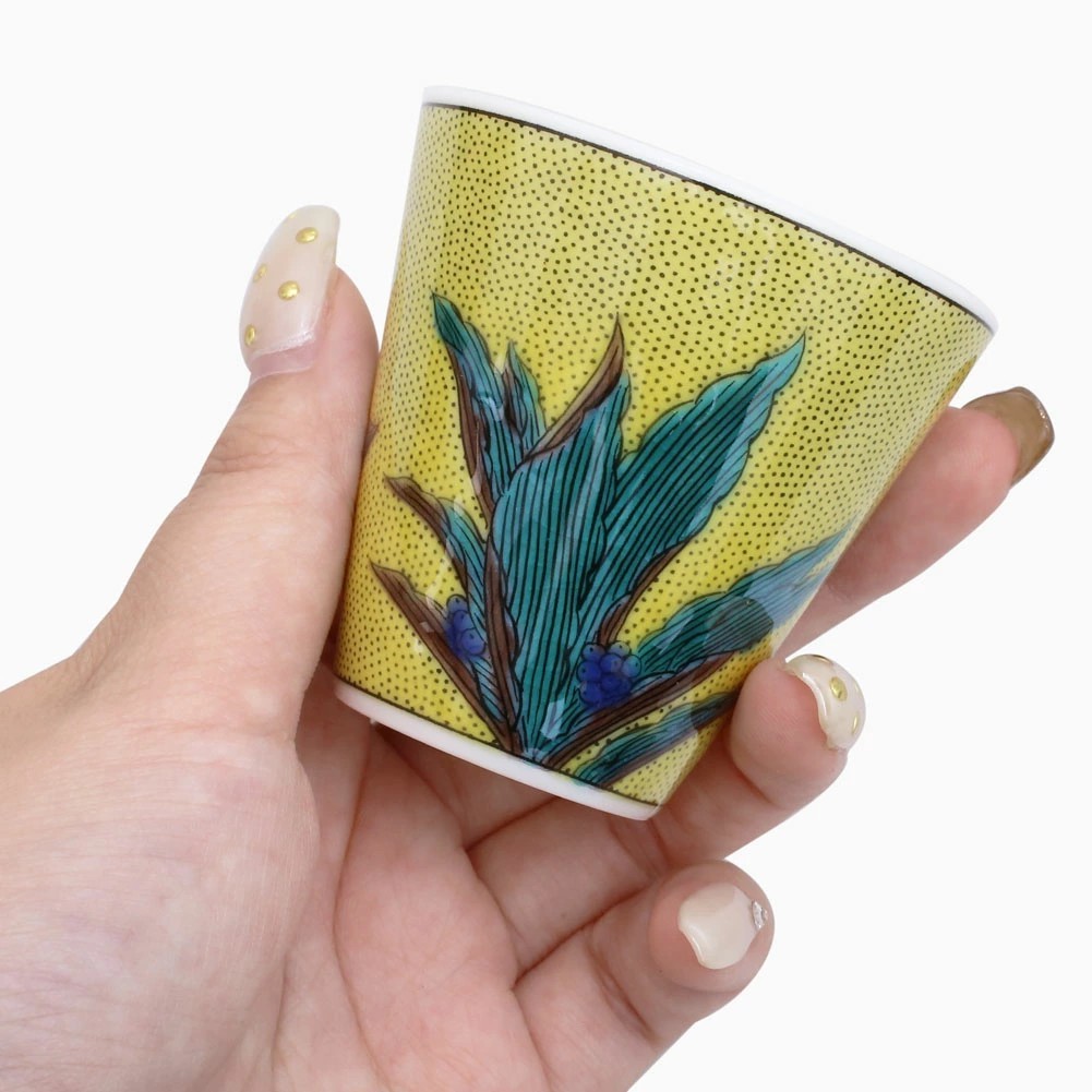 九谷焼は、石川県南部で生産される色絵の磁器です。久谷五彩(赤、黄、緑、紺、紫)という色鮮やかな上絵が特徴です。上絵つきとは、本焼きした陶磁器の釉薬の上に顔料で模様を描き、再度焼く技法です。その歴史は、江戸時代に加賀藩が良質な磁石を発見したのを機に、殖産政策として始められたとされたいます。そんな九谷焼を使った、上品な色合いの色鮮やかなで素敵なお猪口です。オシャレなデザインでおうちのインテリアにもおすすめです。お酒やウィスキー用以外にも、小さい文房具やアクセサリーを入れるなど、用途はさまざまオシャレなお猪口は大切な人へのプレゼントにもお勧めです。無料でハイセンスなラッピングもございます!