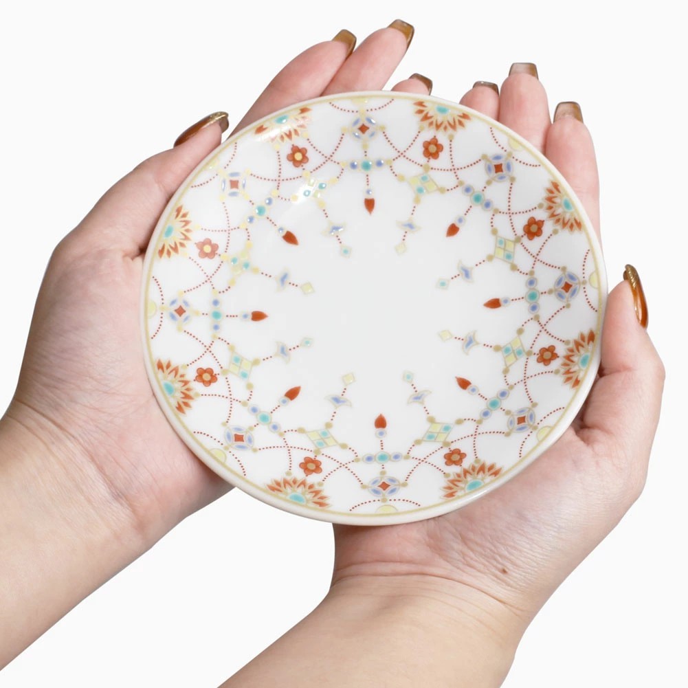 日本製 九谷焼 久谷五彩 磁気 陶器 陶磁器 縁起小皿 瓔珞文 7447-SK25