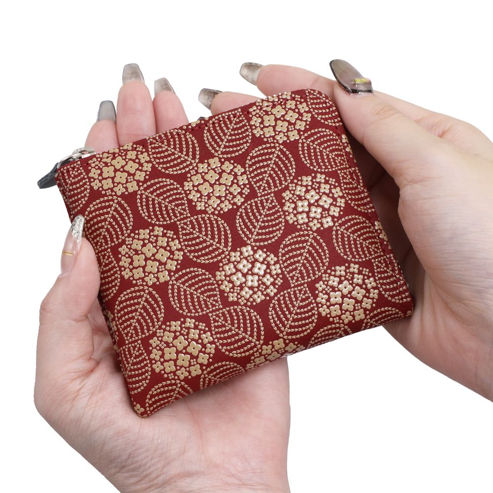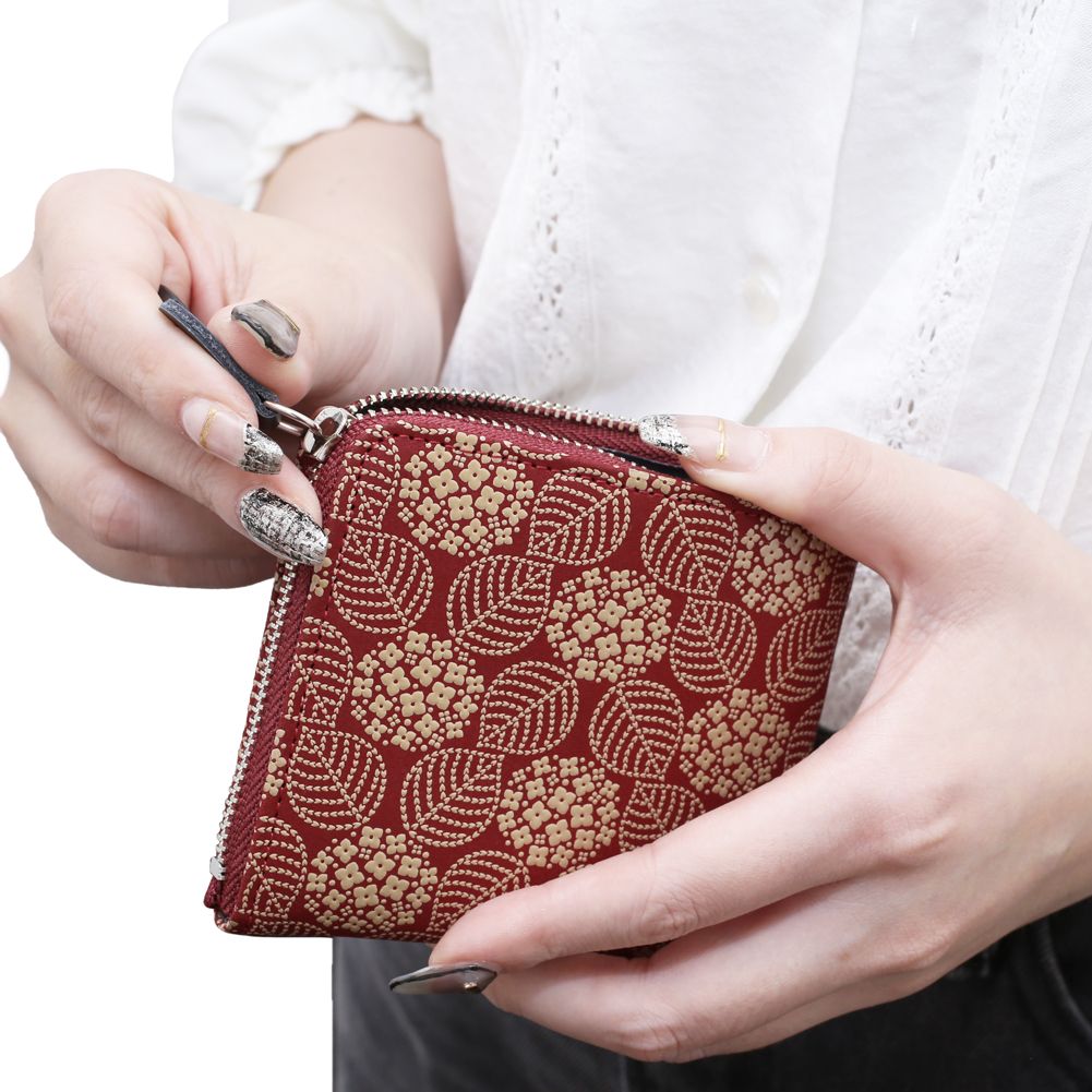柔らかな手触りが人肌に近いといわれている鹿革と漆を融合させ、様々な伝統の模様を彩る、印伝の魅力を育んできた家伝の技。高級感ある、印伝ならではの鹿革と漆の風合いをしっかりと手のひらでお愉しみいただけます。雨に濡れたあじさいは鮮やかな色を放ち、梅雨時の沈みがちな心を潤してくれます。ポケットにも入れられる薄型でコンパクトなデザイン。ポケットにはカードも入れられるのでちょっとしたお出かけにも便利です♪遊び心のある大人っぽい小銭入れは、手のひらにちょうど良く馴染むサイズ感。一目で引かれる印傳屋の小銭入れは、プレゼントとしても喜ばれる逸品です。