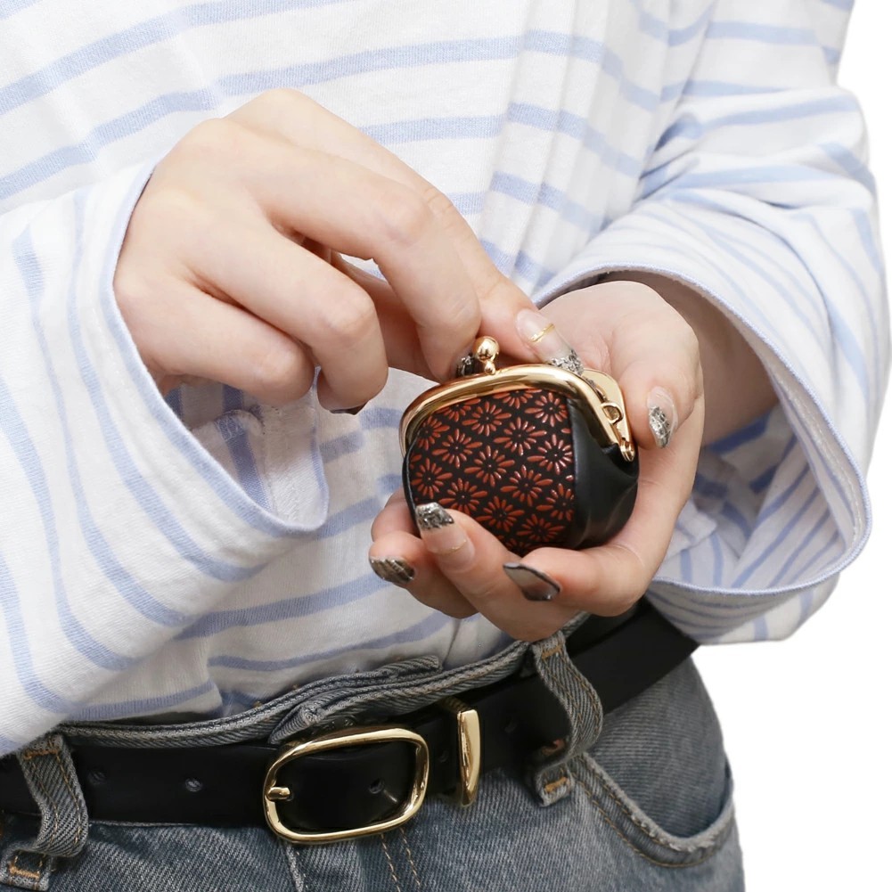 柔らかな手触りが人肌に近いといわれている鹿革と漆を融合させ、様々な伝統の模様を彩る、印伝の魅力を育んできた家伝の技。高級感ある、印伝ならではの鹿革と漆の風合いをしっかりと手のひらでお愉しみいただけます。菊を浸した水「菊水」を飲むと長寿を保つという中国の故事から不老長生の象徴となり、日本でも齢草の異名があります。幅は500円玉がピッタリ入る大きさで、アクセサリーや小物を収納するケースとしてもお使いいただけます。お手玉サイズの可愛いコンパクトながま口小銭入れは、ちょっとしたお出かけや自販機などでさっと使いたいときにも便利です☆一目で引かれる印傳屋の小銭入れは、プレゼントとしても喜ばれる逸品です。