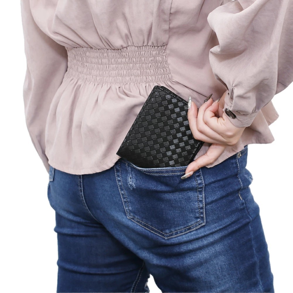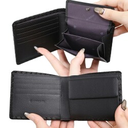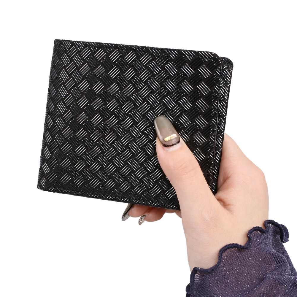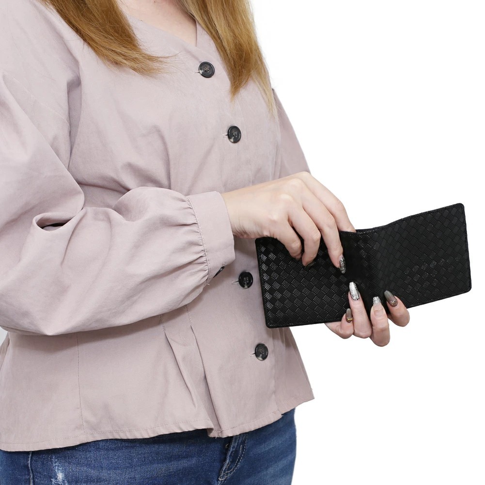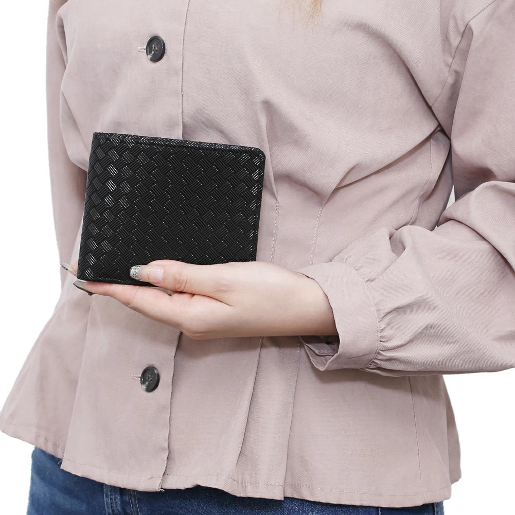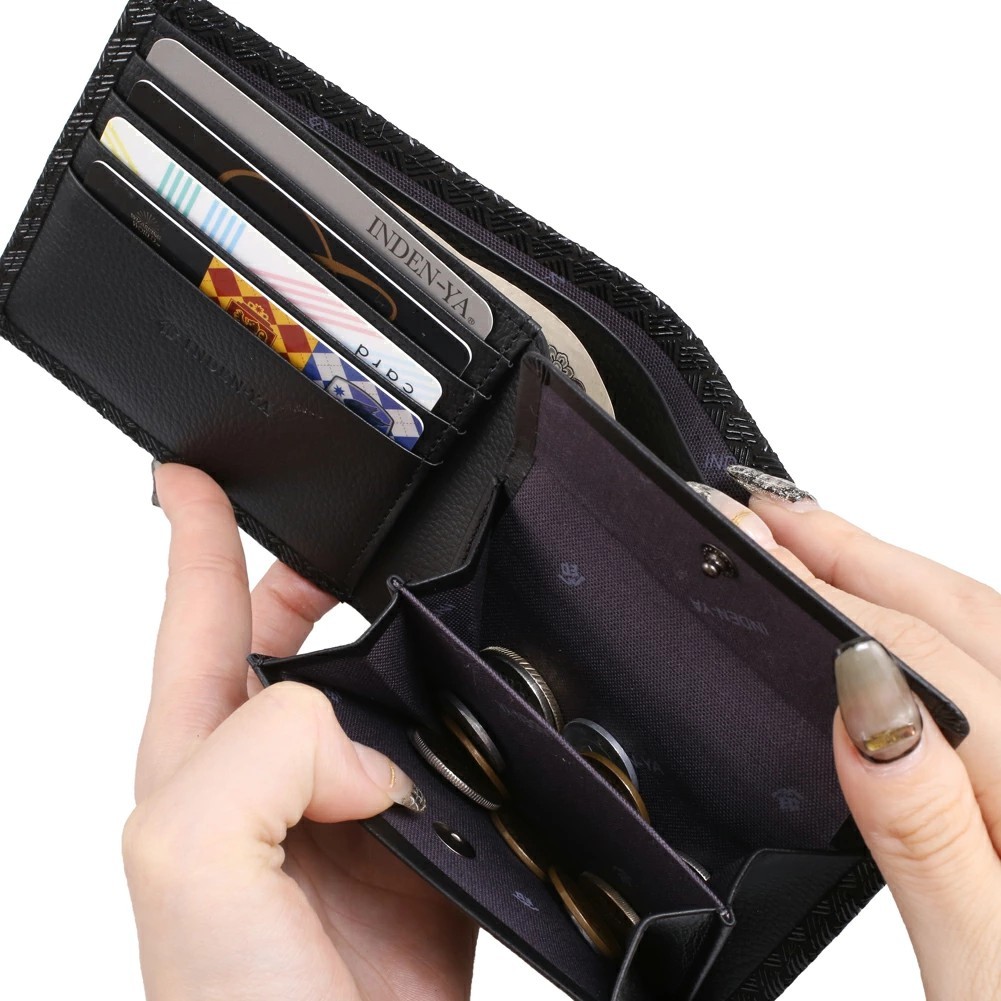 ジャケットやズボンのポケットにも入れられる、二つ折りタイプのコンパクトな折財布。