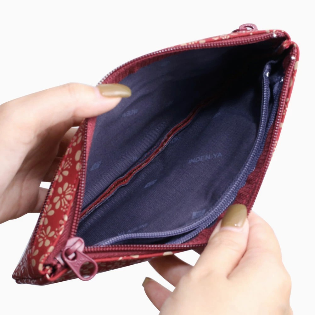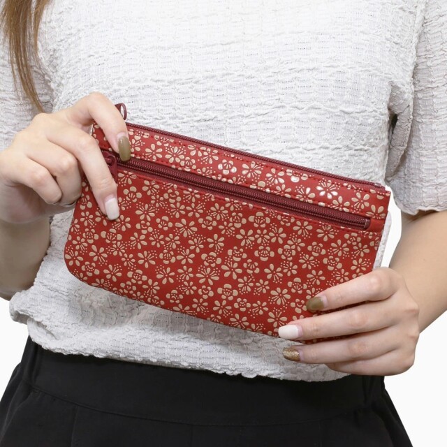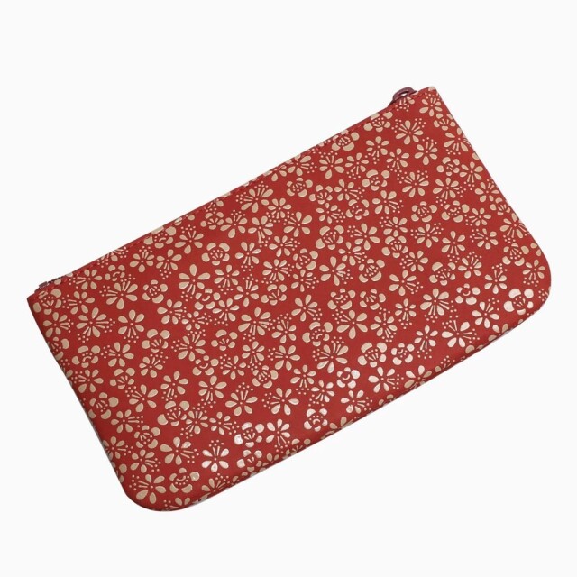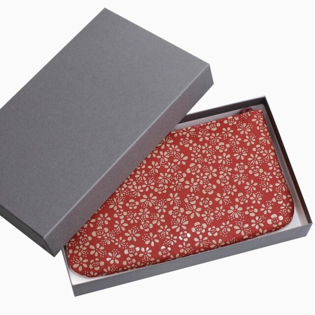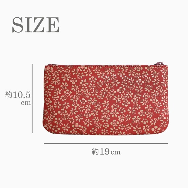 柔らかな手触りが人肌に近いといわれている鹿革と漆を融合させ、様々な伝統の模様を彩る、印伝の魅力を育んできた家伝の技。高級感ある、印伝ならではの鹿革と漆の風合いをしっかりと手のひらでお愉しみいただけます。「万葉集」に多く詠まれた梅の花は平安時代まで花の象徴とされていました。「歳寒三友」と称されたことや厳しい冬から春を迎える喜びを反映した吉祥の模様として用いられてきました。通帳やパスポート、お薬手帳などを収納するのにぴったりな薄型ポーチ。中にはポケットもあり、診察券などのカードもきれいに収納できます。また印鑑や、リップクリームなどの小物も入るのでマルチに活躍します。軽量で薄型のポーチは、小さすぎず、大きすぎない手に馴染む程よいサイズ感。一目で引かれる印傳屋のポーチは、プレゼントとしても喜ばれる逸品です。